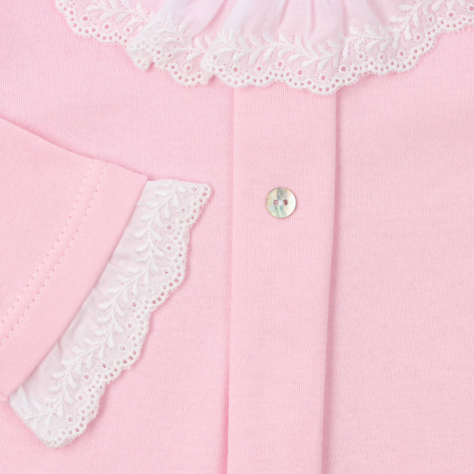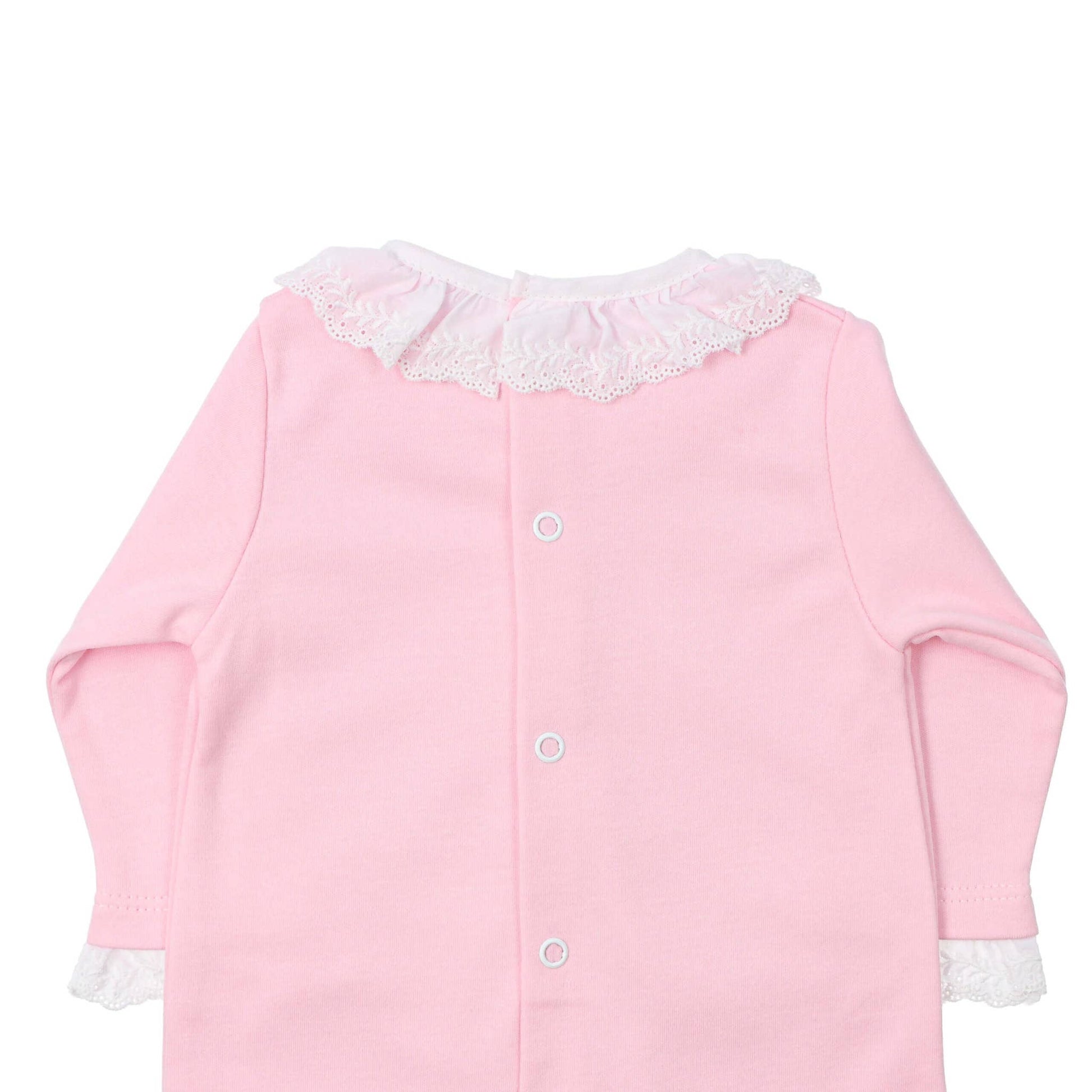 Pink babygrow 100% cotton with brushed interior. It has a collar and cuffs with classic lace. The babygrow opens completely at the back and between the legs with snap buttons for easy dressing of your baby. It is available in nine sizes (000M, 00M, 0-1M, 1-3M, 3-6M, 6-12M, 12-18M, 18-24M, and 24-36M).