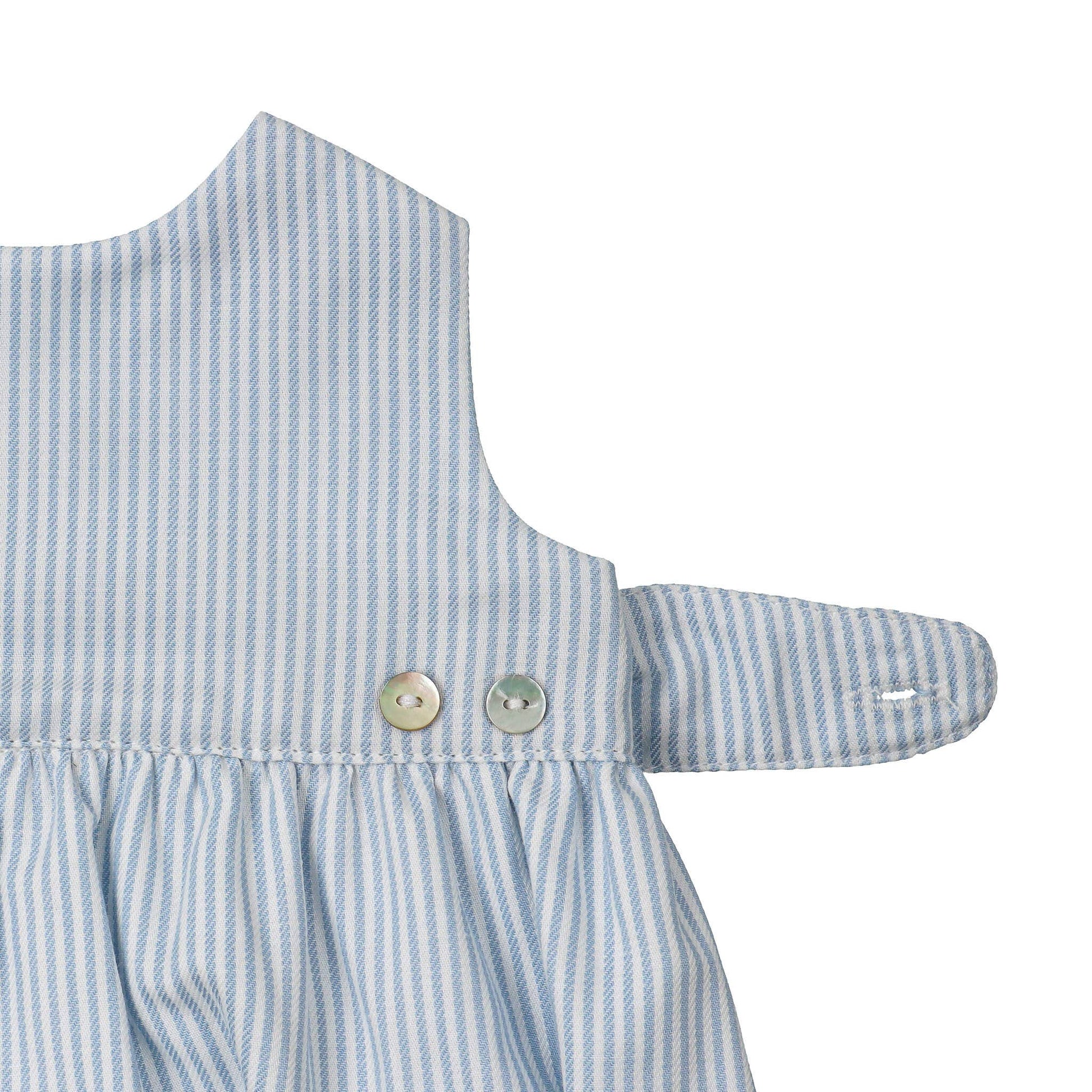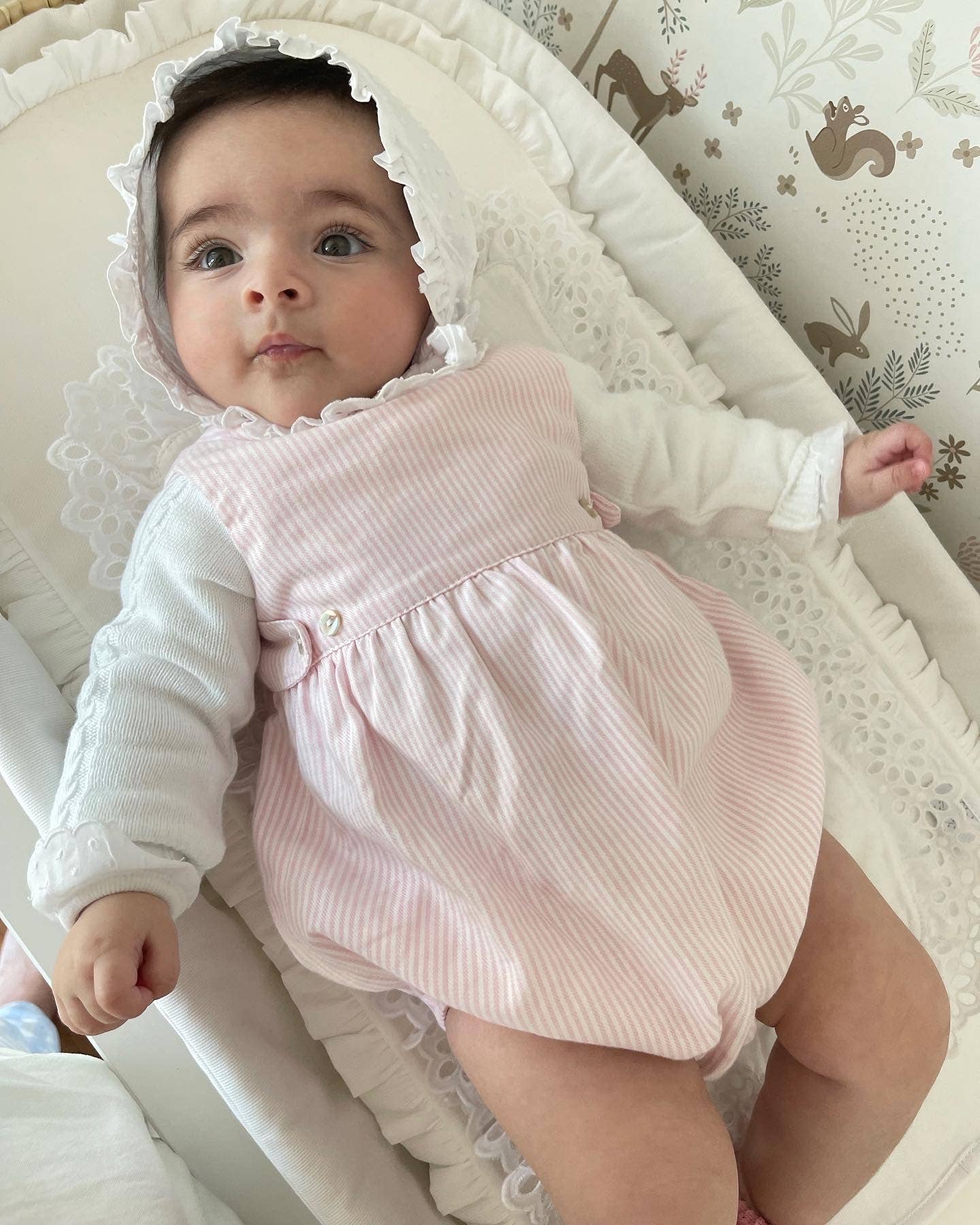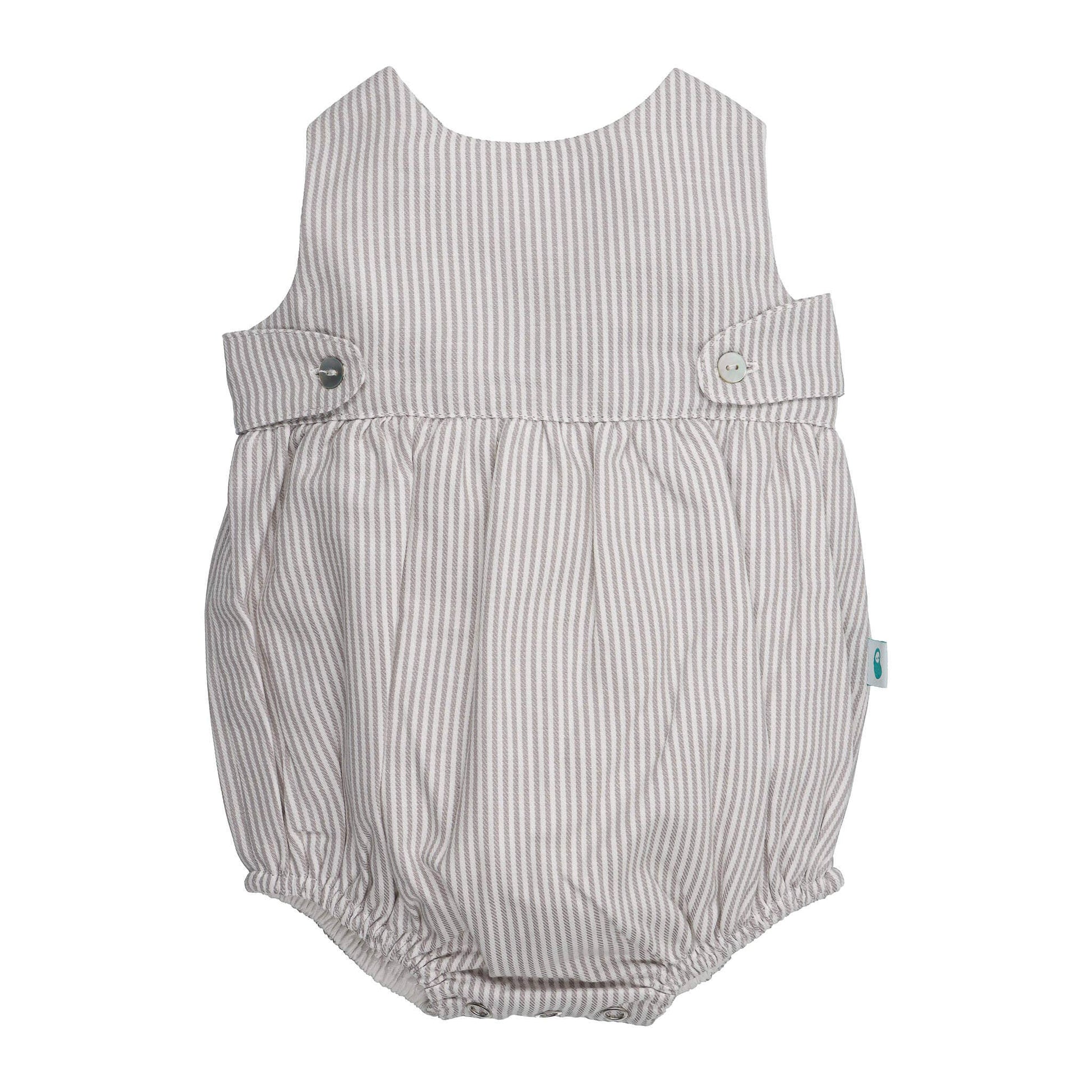 Baby romper 100% Cotton, with inner lining, elastic at the legs, and snap fasteners at the crotch. Fastens at the chest with mother-of-pearl buttons and has a crossover at the back. Available in three colors (Light Blue, Gray, and Light Pink) and five sizes (0-1M, 1-3M, 3-6M, 6-9M, and 9-12M).