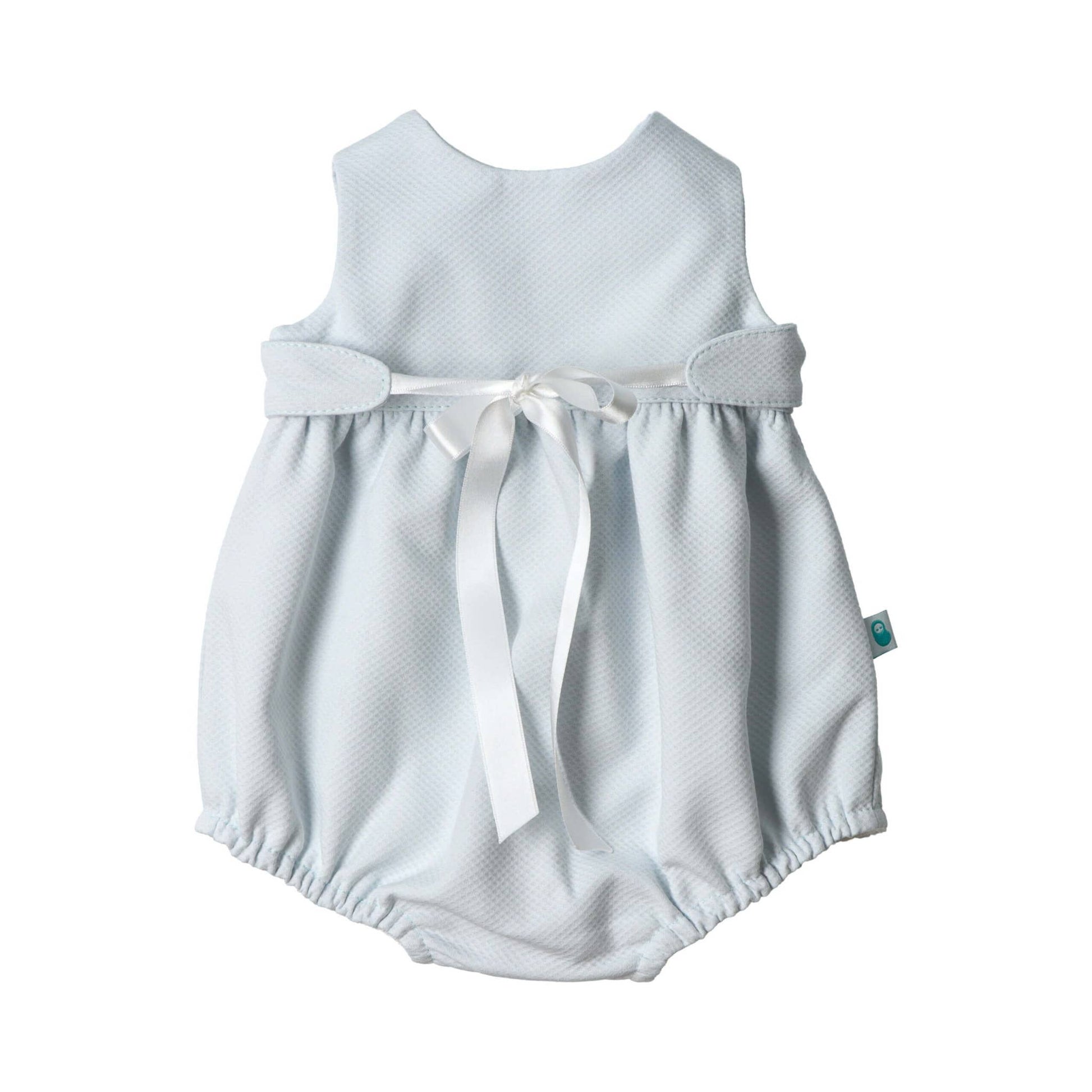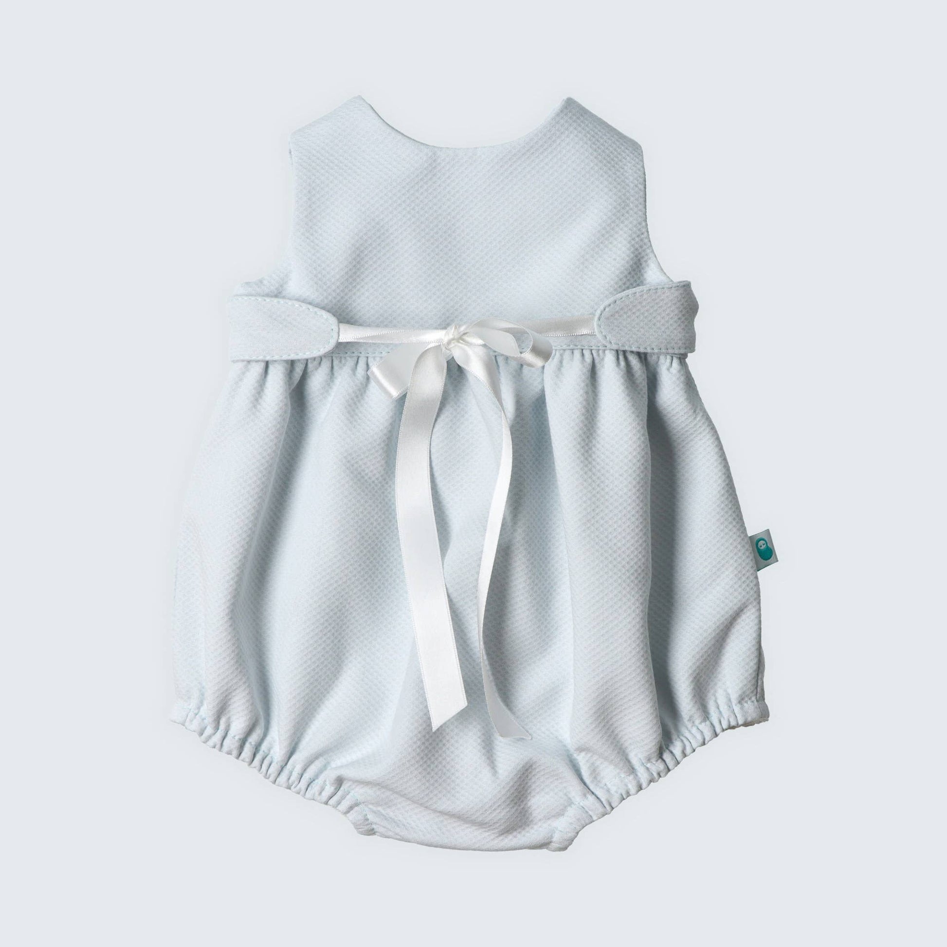 Classic romper in 100% cotton Piquet fabric with white satin ribbon, inner lining, elastic at the legs, and snap buttons at the crotch. Fastens at the chest and with a crossover at the back. Available in two colors (Light Blue and Light Pink) and three sizes (0-1M, 1-3M, and 3-6M).