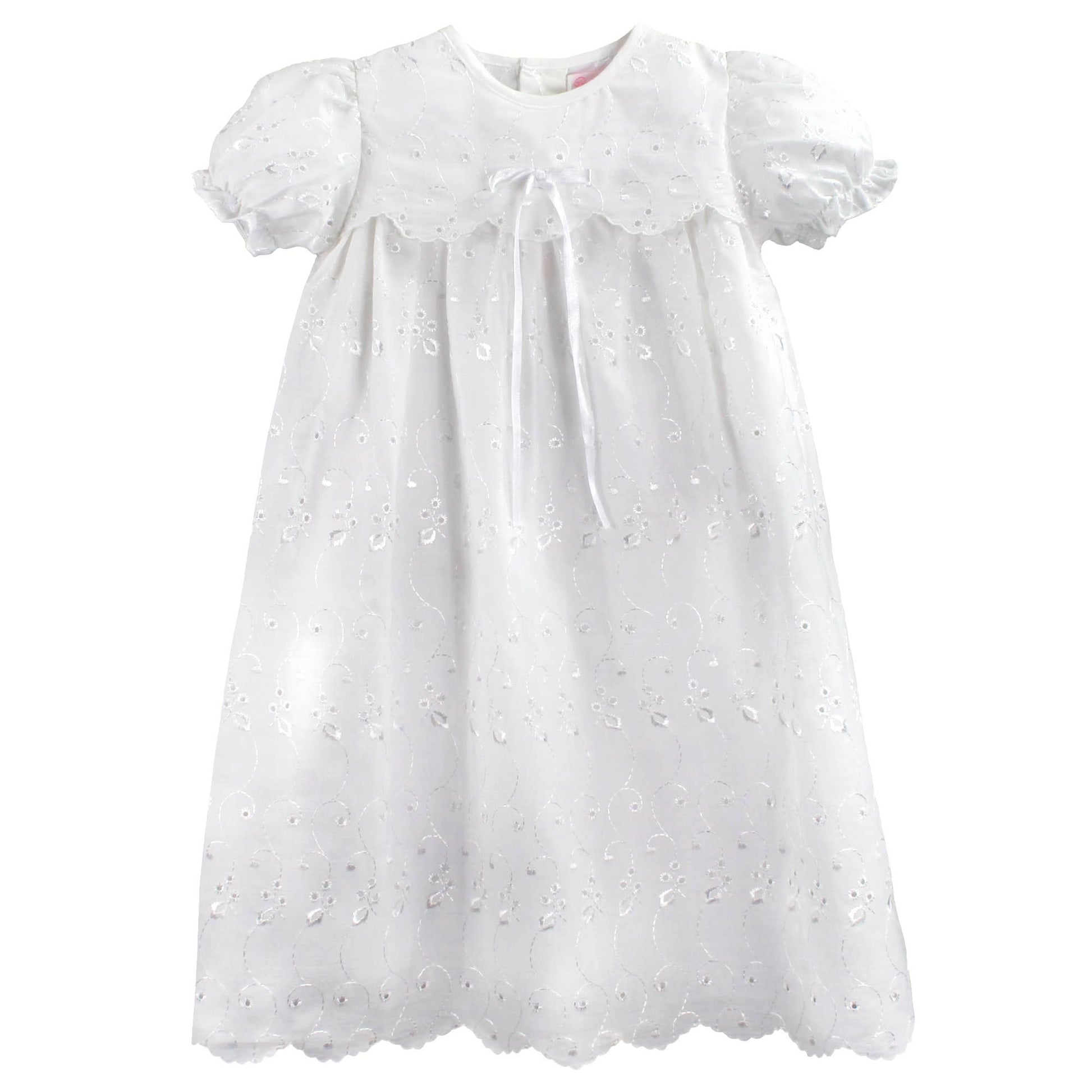Our beautiful white eyelet lace dress with scallop embroidered hem edge and yoke is feminine and sweet and makes a perfect baptism or christening outfit for baby girls.
