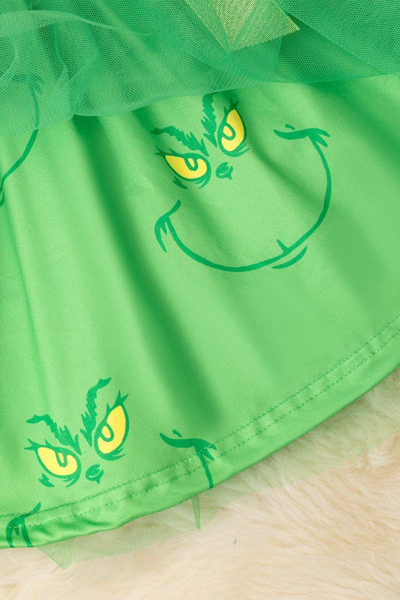 This girls' dress features a festive multi-Christmas character print, crafted from a comfortable blend of 95% polyester and 5% spandex for flexibility and durability. The side bow detail adds a charming touch, making it perfect for holiday celebrations while ensuring ease of movement and long-lasting wear.